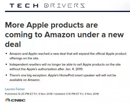 2018年11月9日,卖家收到了亚马逊的通知,亚马逊告知卖家必须在2019年1月4日平台移除所有listing前,售空所有现有产品。并建议希望继续在平台上销售苹果产品的卖家,主动与苹果公司取得联系,成为苹果授权经销商。目前,未获得授权的卖家依旧可以在eBay、Craigslist,或者自己的网站上销售苹果产品。