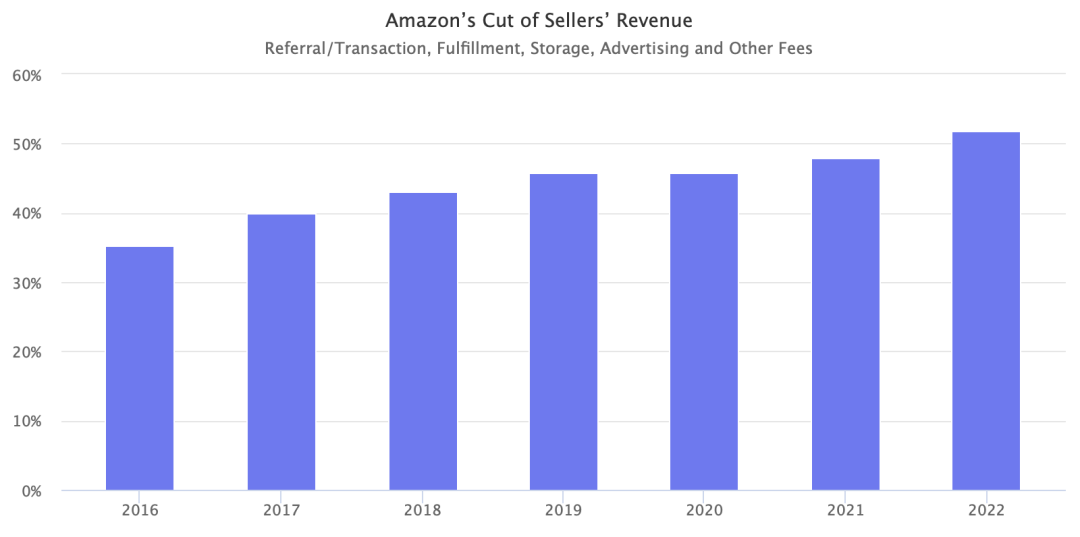 据预测,未来几年的广告流量成本也只会越来越高,而无法越来越低。同时,平台屡次调高运营费用,如物流、库容等,以及平台上卖家的不断内卷,价格战等原因,使得亚马逊卖家的利润不断被压缩,部分卖家的利润无法支撑公司经营成本,因此也选择黯然退场。根据MarketPlace Pulse发布的数据显示,2022年亚马逊卖家的运营成本已经占到了其销售收入的50%以上。